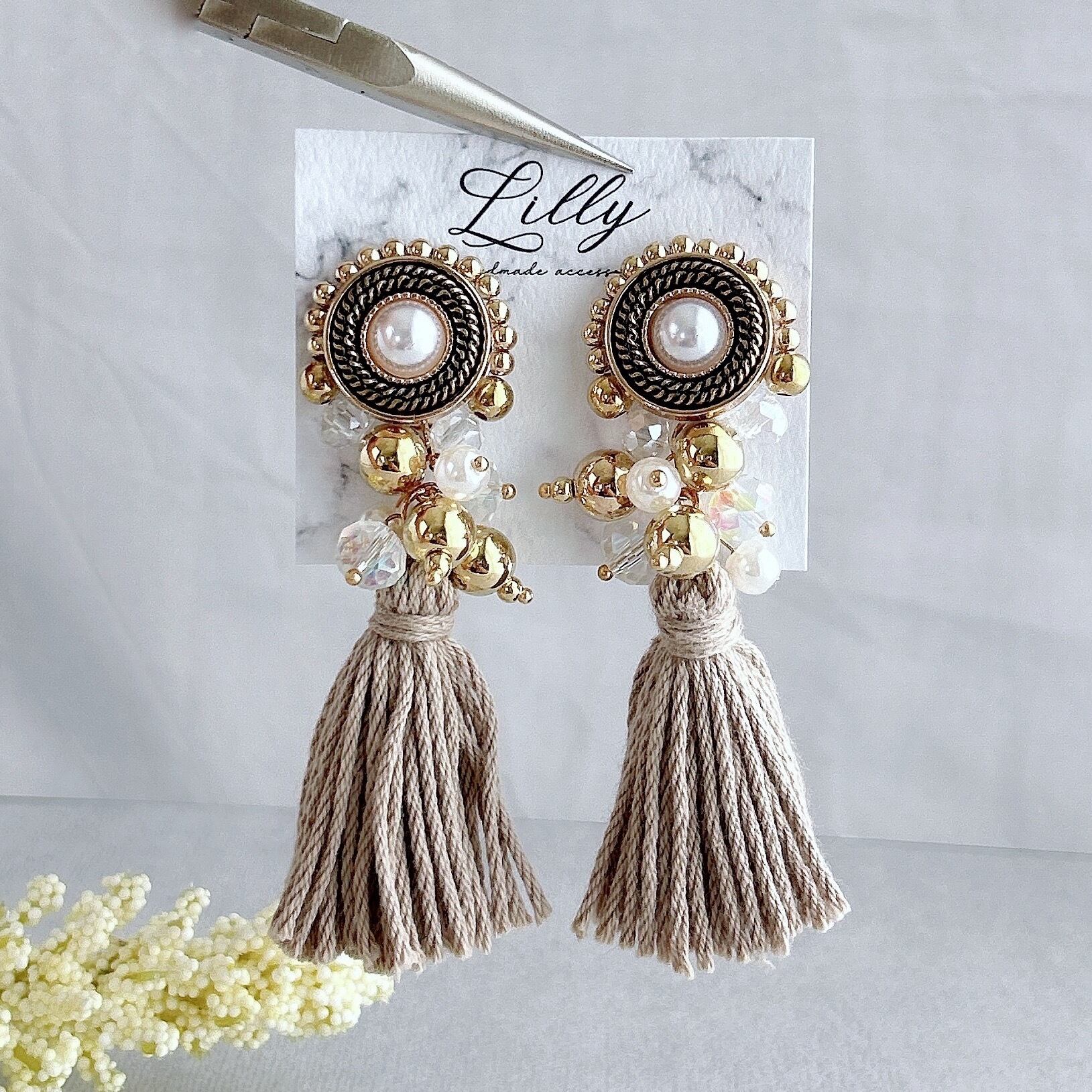 #889大ぶり/タッセル/ビーズ刺繍/ゴールド/ハンドメイドピアス イヤリング