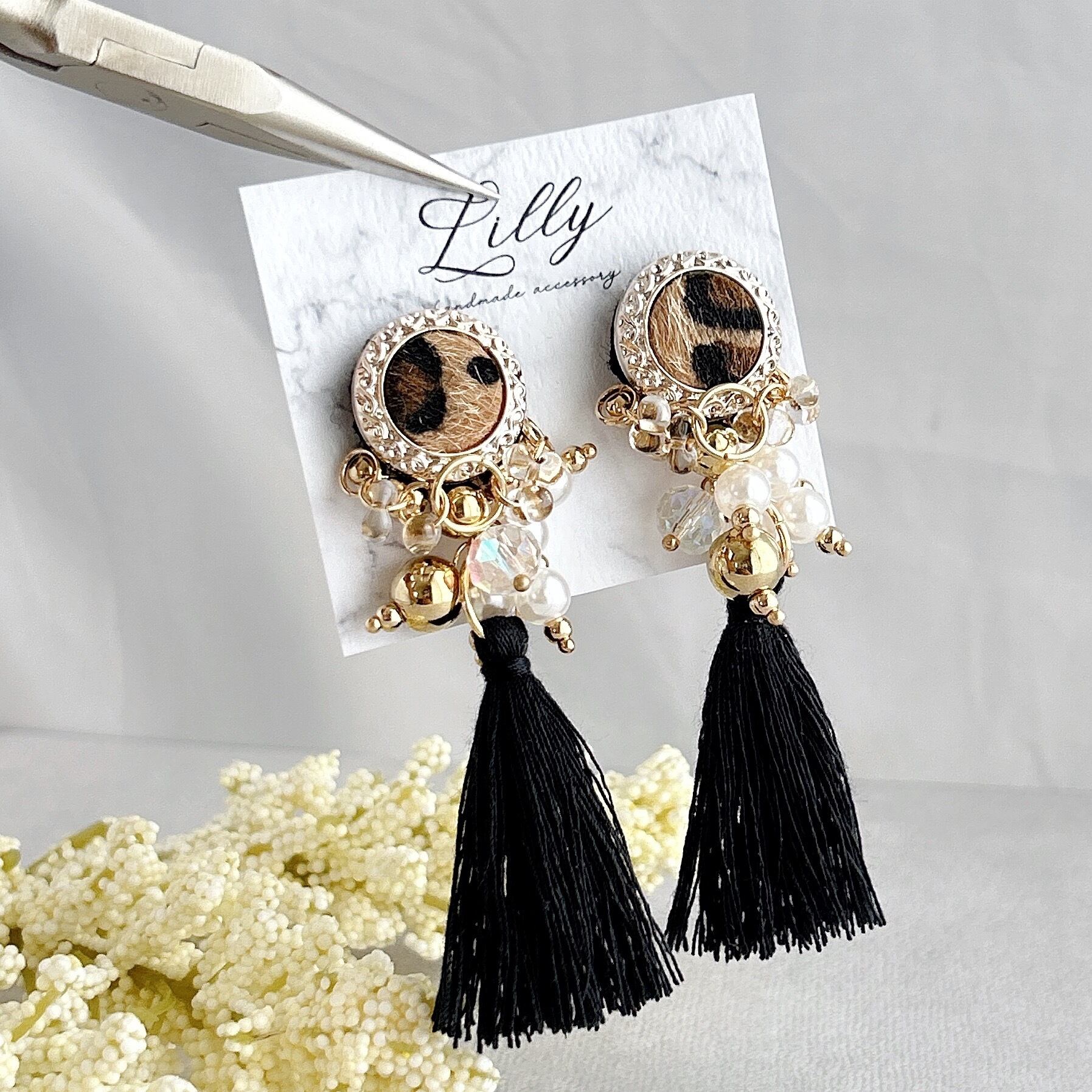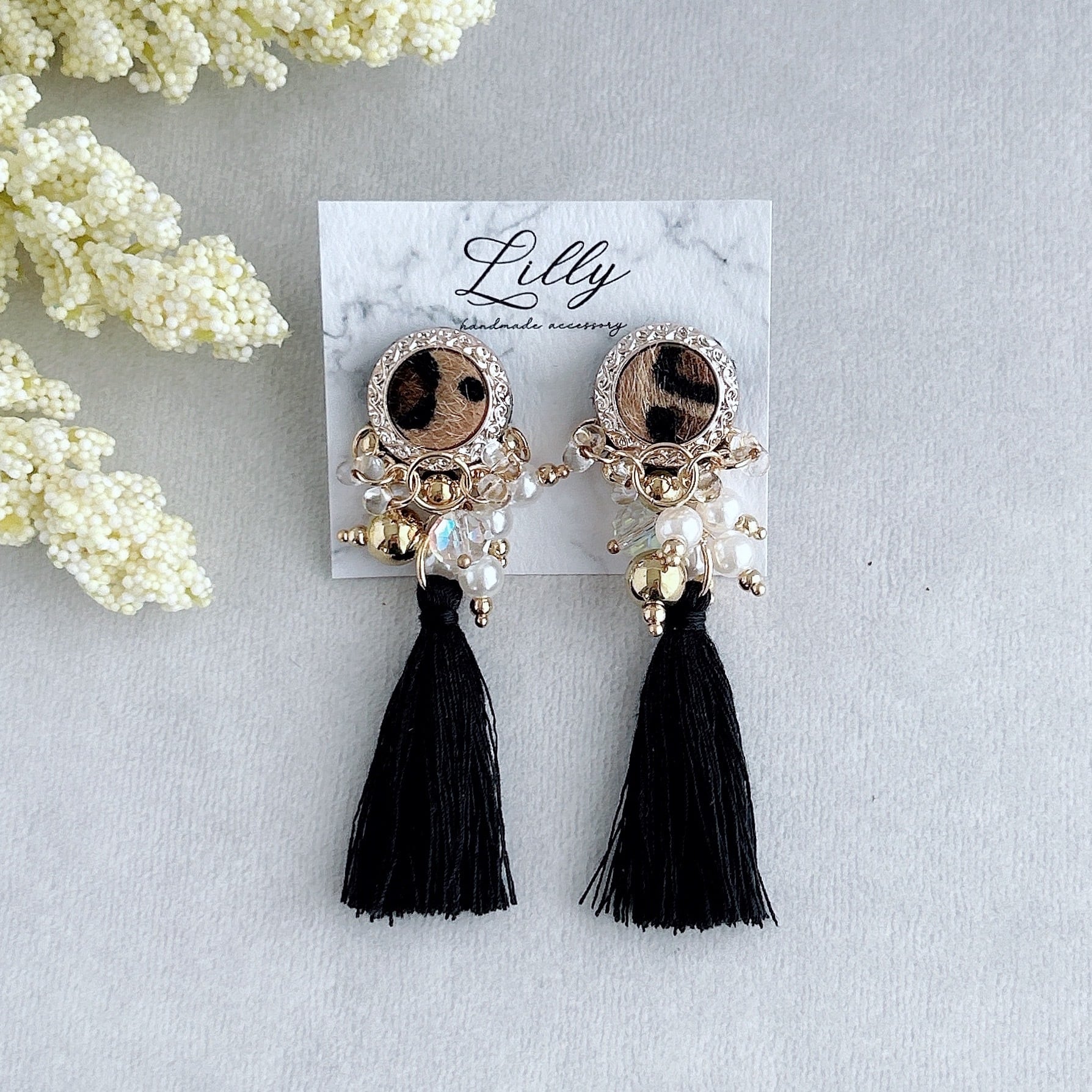 #890 大ぶり/タッセル/ブラック/レオパード/ビーズピアス/ハンドメイド