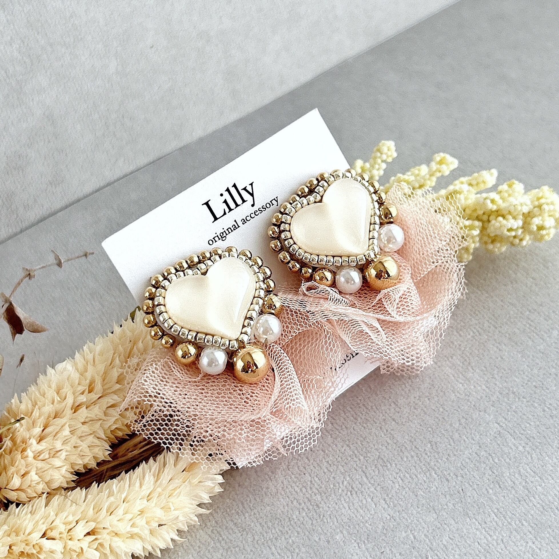 #933 大ぶり/ビーズ刺繍/ハート/チュール/パール/ゴールド/ハンドメイド