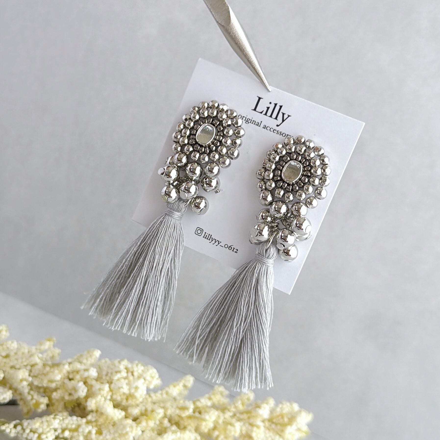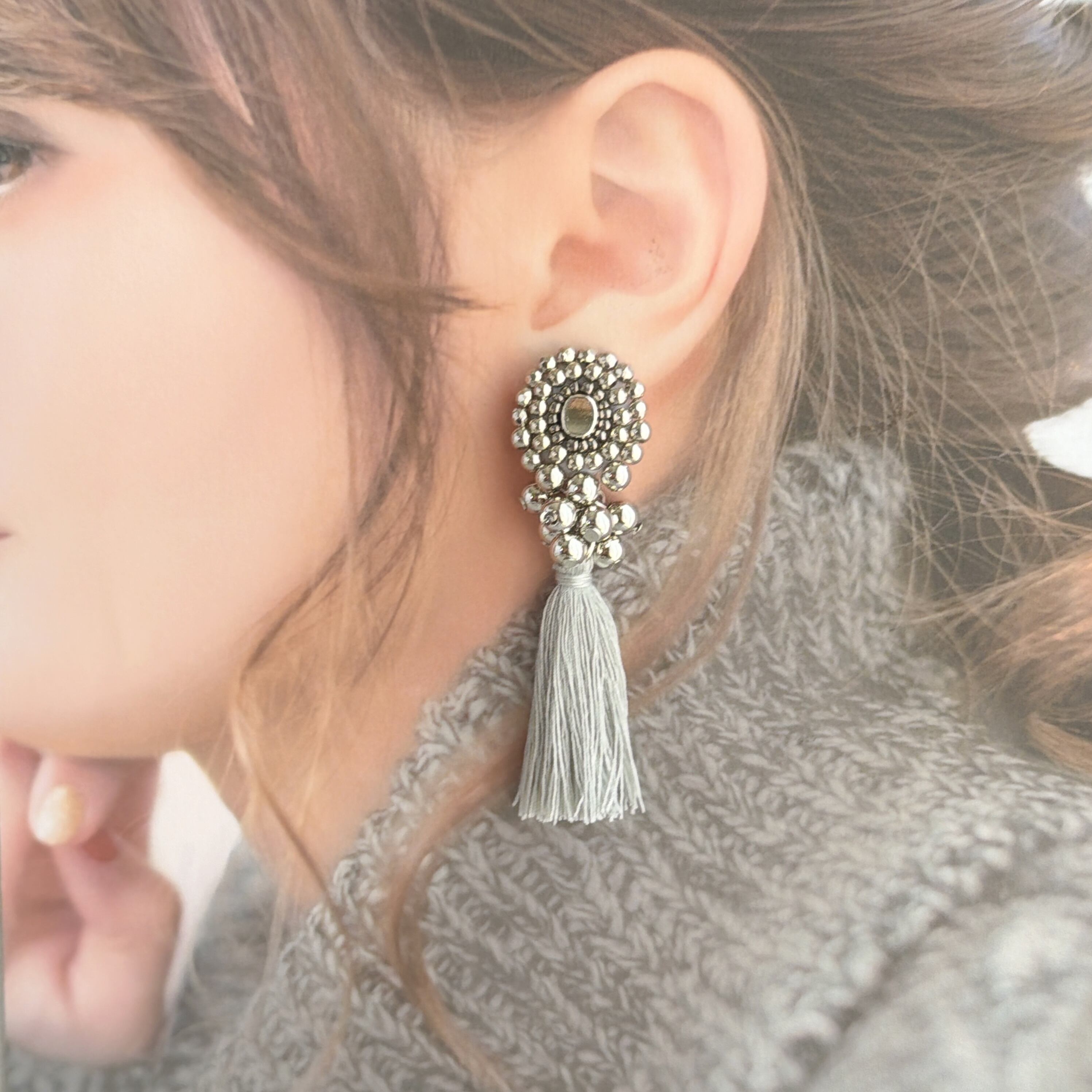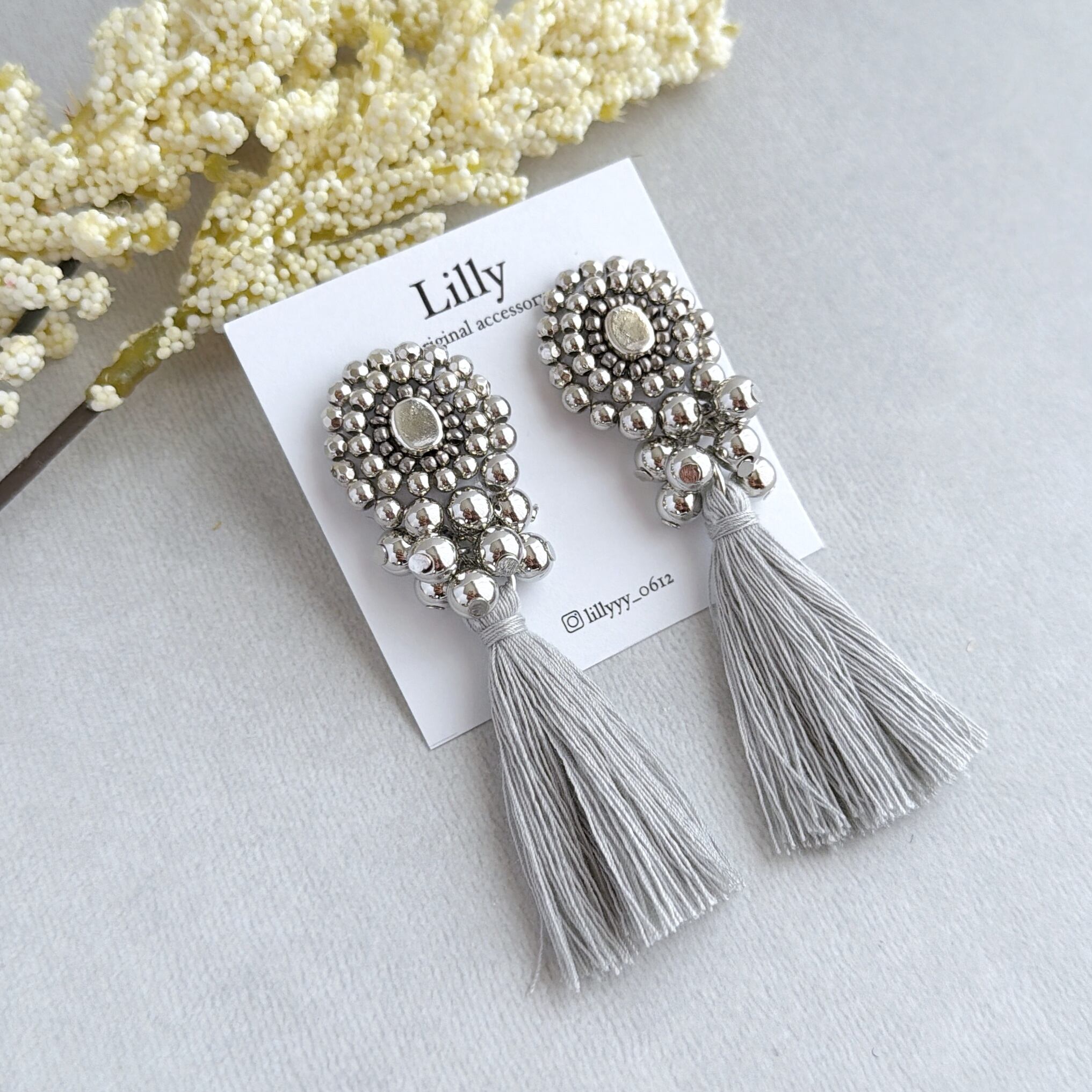 #965大ぶり/ビーズ刺繍/シルバー/タッセル/ハンドメイドピアス イヤリング