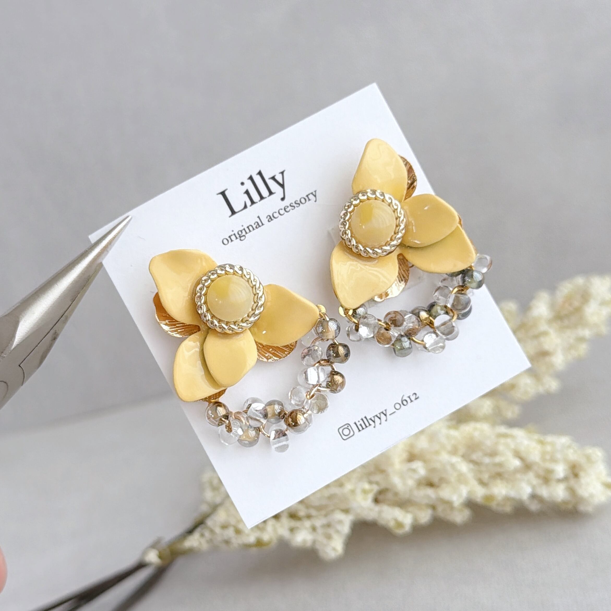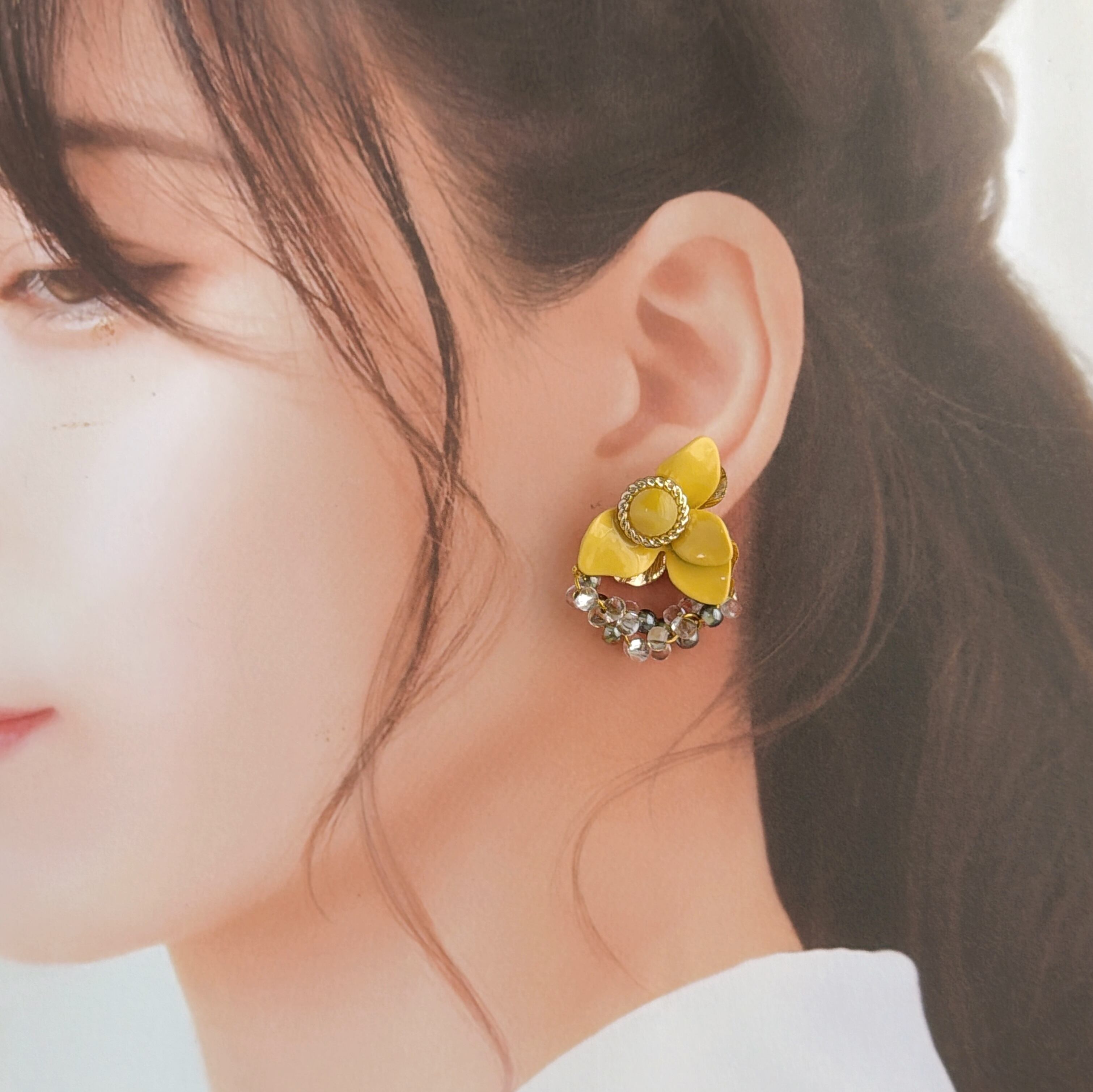 #975 大ぶりピアス/フラワー/イエロー/ビーズ/揺れる/ハンドメイドピアス