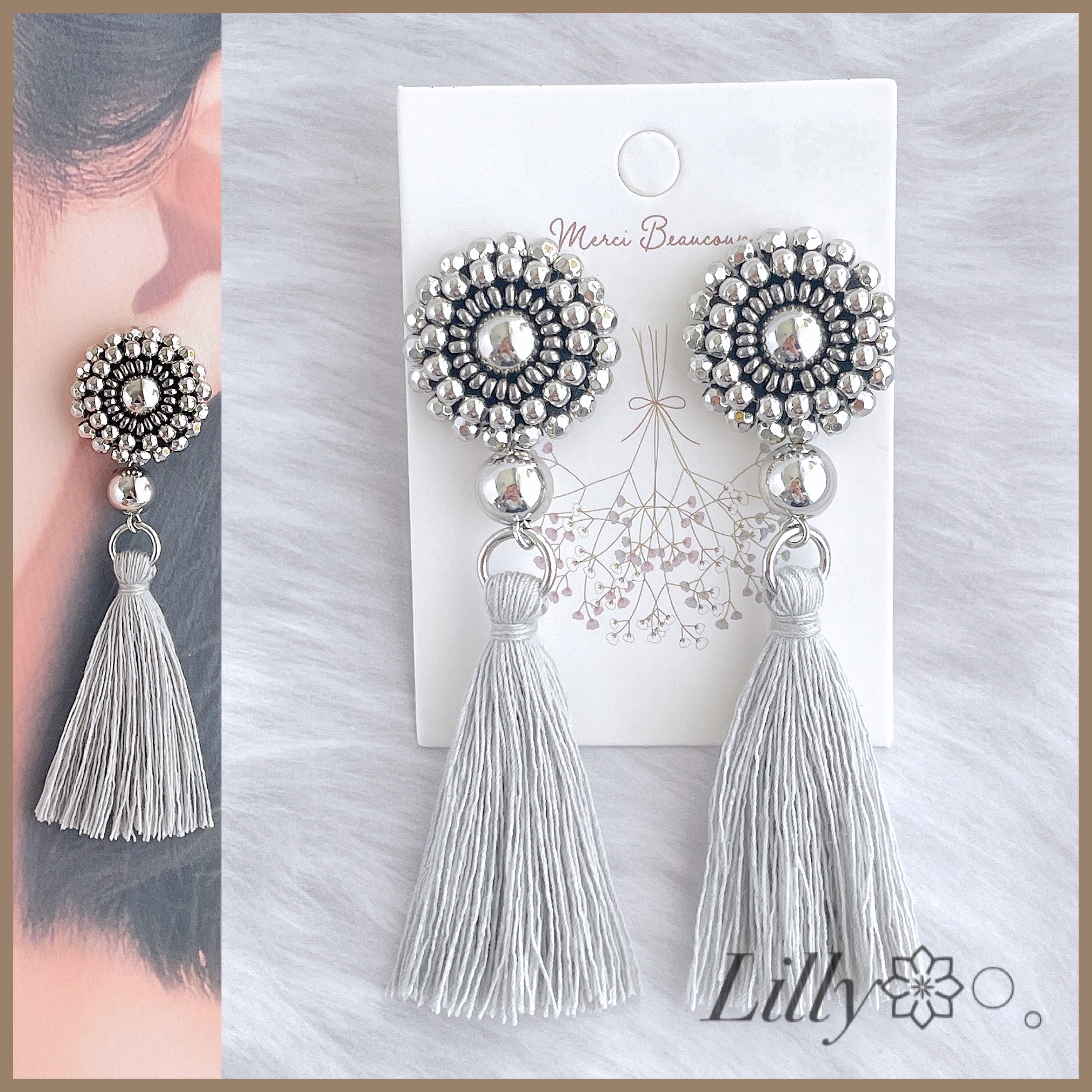 189 大ぶり/シルバー/花/タッセル/ビーズ/ハンドメイドピアス◈イヤリング