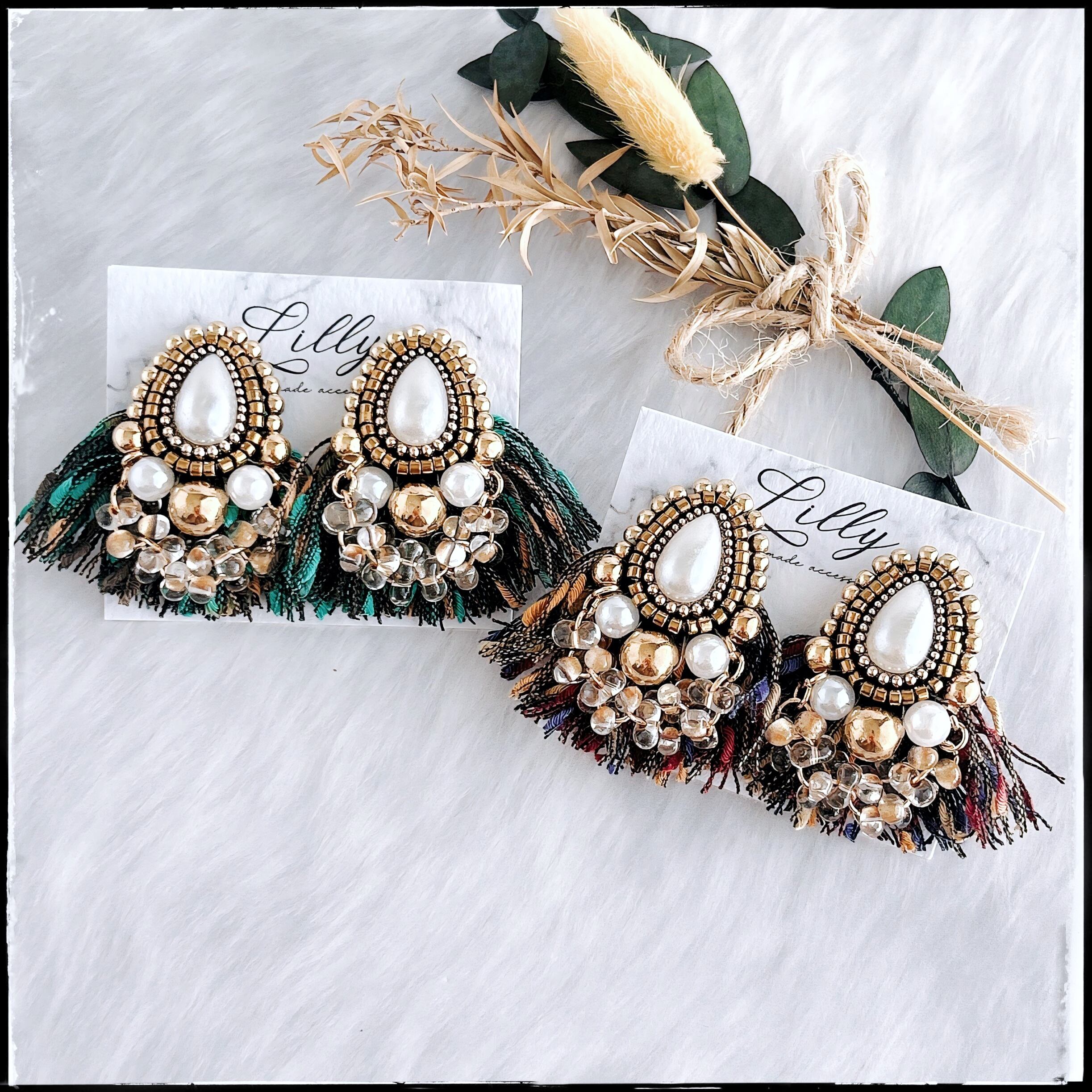 #646大ぶり/ビーズ刺繍/フリンジ/ゴールド/ハンドメイドピアス♢イヤリング